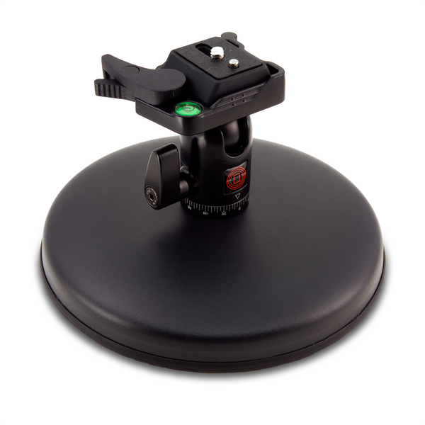 The Base is a solid 7” round steel foundation with an integrated  ⅜-16 screw mount and soft rubber padding to protect surfaces from scratches. Weighing almost three pounds, your equipment will be stable and sturdy.