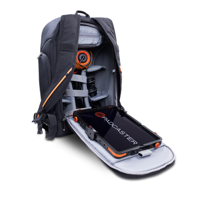 Fully padded with five velcro dividers, removable internal zipper pouch, tripod holder and waterproof cover - the rugged, elegantly designed Padcaster Backpack securely carries your entire mobile studio with ease.